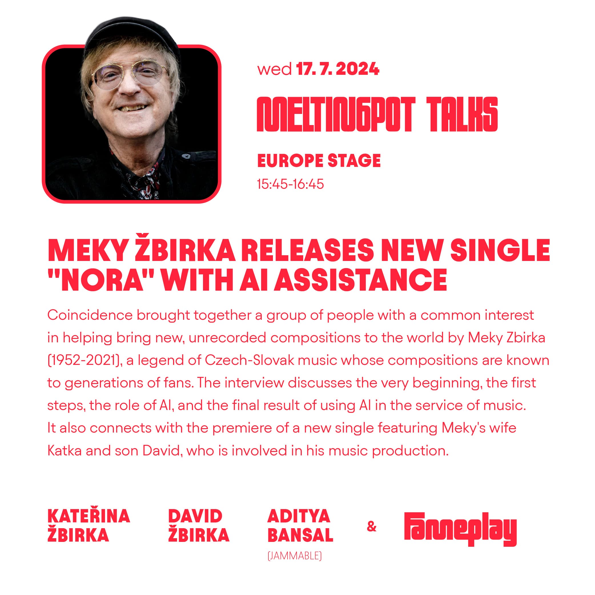 “Moc si vážíme důvěry, kterou do nás Katka a David vložili. Ve Fameplay prozkoumáváme všechny možné nástroje generativní AI. Vyzkoušeli jsme jich více než dvě stovky a s těmi nejlepšími denně pracujeme. Najít tedy vhodný proces a pospojovat dostupné nástroje tak, aby mohla vzniknout čistá a v rádiích hratelná verze písně, kterou už Meky Žbirka nemohl dokončit, pro nás bylo hezké dobrodružství. Jsme rádi, že zrovna hlas tohoto skvělého umělce jsme mohli oživit a umožnit tak vznik písně Nora ve finálním hudebním aranžmá Davida Žbirky. A to, že naši společnou práci můžeme představit na festivalu, jehož fanoušci jsme už dlouho, je pro nás zkrátka ctí. Je to první naše aktivita, kterou na festivalu uvedeme námi kurátorovaný a pečlivě připravený AI obsah,” dodává Juraj Felix, který má v CMI Fameplay na starosti.